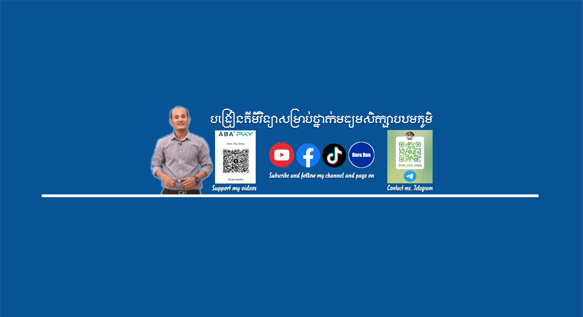 សិស្សានុសិស្សនៅមធ្យមសិក្សាបឋមភូមិ ថ្នាក់ទី៧ ទី៨ និងទី៩ ជាច្រើននាក់ តែងត្អូញត្អែថា មុខវិជ្ជាគីមីវិទ្យា ជាមុខវិជ្ជាមួយ ដែលពិបាកសិក្សា។ ពួកគេតែងនិយាយប្រាប់ខ្ញុំថា ពួកគេរៀនគីមីមិនសូវយល់ គីមីពិបាករៀន និងអ្នកខ្លះថារៀនមិនចេះ។ តាមបទពិសោធរយៈពេលជិត២០ឆ្នាំ ក្នុងការបង្រៀនគីមីវិទ្យា ខ្ញុំគិតថា ពួកគាត់នឹងទទួលបានពិន្ទុគីមីវិទ្យាល្អ រាល់ពេលដែលមានការប្រឡង ប្រសិនបើពួកគេធ្វើតាមការណែនាំរបស់ខ្ញុំ។ សង្ឃឹមថា ការចែករំលែករបស់ខ្ញុំ នឹងបានជាប្រយោជន៍ ដល់ប្អូនៗអ្នកសិក្សាទាំងអស់គ្នា។ ទំនាក់ទំនង(Telegram) ៖ 090 711 911។